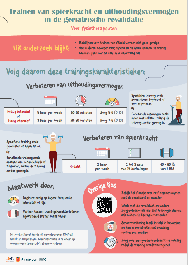 De poster ‘Trainen van spierkracht en uithoudingsvermogen in de geriatrische revalidatie’ laat zien welke trainingskarakteristieken je moet volgen om effectief te trainen. Ook staan er andere tips op die bijdragen aan het verbeteren van fitheid van de revalidant.
