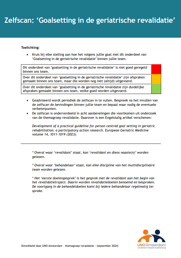 Met de zelfscan ‘Goal-setting in de geriatrische revalidatie’ kan het revalidatieteam zelf beoordelen waar het goal setting proces verbeterd kan worden en gerichte verbeteracties ondernemen. Iedereen vult de zelfscan eerst zelf in. Daarna bespreekt het team de resultaten en verbeteracties in een teamoverleg.